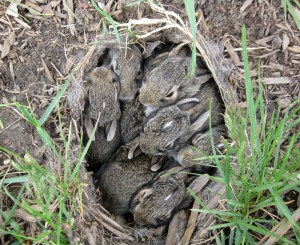 My garden is a critter-friendly zone. We have the fattest squirrels you’ve ever seen (because we feed them), a large network of chipmunks, several possums, a groundhog, a few moles living under the compost pile, the occasional raccoon and skunk, and every now and then, a coyote. So far, my garden has survived just fine and we enjoy watching the critters. Rabbits (like the little cuties shown in the photo, courtesy of my mom’s yard) would probably cause me some angst with their eating habits, but all the roving outdoor cats on my block have made this a rabbit-free zone. I don’t condone letting cats roam outdoors, but I admit to being glad I don’t have to worry about bunnies nibbling on my flowers. My mother has made peace with them. She figures she has so many flowers, she can afford to sacrifice a few. A good attitude! And a necessary one if you live in a bunny-friendly yard like hers.