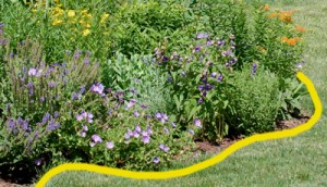 Keeping a purposeful border between our garden and our lawn takes commitment. The lawn is determined to steal back the spaces we’ve claimed from it. So every spring, it’s time to grab the sharp shovel and clean up that edge. When your garden gets big, that’s a lot of edge! I have spent many an hour sitting on the ground, shaking dirt and worms out of chunks of removed turf. One good thing about my borders, they are free-form curves. (See the yellow line in the photo as an example.) With curves, it is easy to enlarge the garden just enough to fit in one more plant. Or two. Or three. Just bump out the border with another curve! You can’t possibly mess it up; no measuring or mapping out lines is involved; and best of all, it looks really soft and pretty.