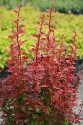 I am thrilled that there is now “Little Lime” Hydrangea (a 3-foot version of Limelight…perhaps the best hydrangea out there), “Little Devil” Ninebark (a 3-foot version of the gorgeous red Diablo Ninebark), and a few so-called “pillar” barberry bushes (like the brilliant-hued Orange Rocket, shown in the photo) that only get 18 inches wide, but 4 feet tall. I planted three of these in a corner of my flower bed just last summer. I think it’s a great idea to introduce small shrubs into flower beds. They add structure and fullness when your flowers are still growing, plus they are gorgeous in their own right. Definitely a trend to try! So say I, an aspiring gardening trend-setter.