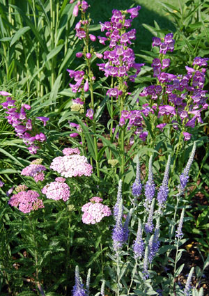 I’d like to say I always plan ahead for good color combinations in the garden. Sometimes, I do. Sometimes, I get lucky, as with these three different purple plants blooming at the same time to form a glorious little combo. Shown in the photo: Penstemon “Prairie Dusk”; Purple Yarrow; and Speedwell (Veronica incana) “Pure Silver.”