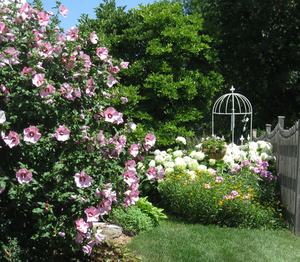 Many gardens are not looking so fine at this point in the summer. And rarely do I see an entrance to a garden that makes me go “wow.” So it is with double the pleasure that I post this photo from my garden mentor, my mother, taken just this week. As you walk from the front of her house, around the side and into the backyard, you are greeted by an Aphrodite Rose of Sharon (on the left) and an old-fashioned charmer of a combination of yellow black-eyed susan, pink phlox, and fluffy white Annabelle hydrangeas on the right. Plus a nifty wrought iron garden decoration. I even enjoy the magnolia tree in the middle of the photo, which has bright green foliage all summer. If you have a fabulous backyard, you probably already have some flowers spilling over to the front, but it’s fun to consider what glimpse of your yard passersby get as they walk by.