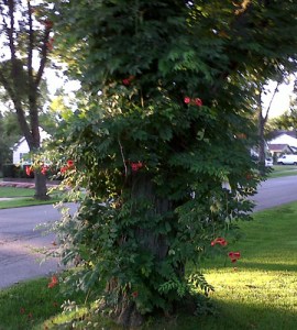 I had to snap a photo of this amazing sight I saw while walking around the neighborhood this morning. At first, I thought the trees were starting to turn colors a bit early. Then I realized these weren’t orange leaves, but orange flowers. Yes, my friends, this person is growing an extremely large bugle vine on an extremely large tree. The vine goes up about 16 feet or so. Since the tree is on a corner, it’s getting enough sun from the sides. I do wonder what the squirrels think about this, but I admire the fact that someone finally found a place where a bugle vine has enough room to grow to its full height.