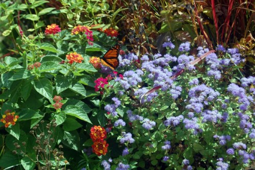 I fully own up to having little patience with annuals in pots. The extra care they need to look good all season confounds me. I have had better luck with adding annuals into my perennial beds. These two have definitely given me a return on my investment: Ageratum (the blue one) and Lantana (the hot-colored one). Here it is, late October, and they are just about the only flower game left in town, as this lone Monarch attests to. (I seriously hope that lone Monarch heads for Mexico soon.) I will definitely be purchasing these two annuals again next year, especially more Ageratum. That little blue plant never quite blooming all year, whereas the Lantana had to “re-load” periodically. Both plants can be a little tricky to find, though, so buy them early in the season to make sure you find them at all.