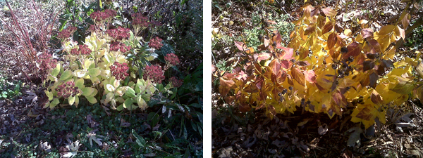 Having had a fairly lucky gardening year, I would be remiss not to post to this blog on the special date of 11-11-11. Happy Numerological Oddity Day! Well, frost has finally come to my garden, but still not as hard as it has in past Novembers. I have a few splashes of purple mums, hardy geraniums, and even alyssum still fighting the good fight. I wanted to make mention of some flowers that pull double-season duty by putting on a good show of colored foliage in the fall. On the left is a sedum called “Neon” which appropriately has foliage that glows this time of year. On the right is a balloon flower. Balloon flowers, in addition to being long blooming in the summer, put on quite the show of colors in the fall. So you will find me both looking up at the trees and looking down at my plants this month as I try to soak it all in. May this day bring good luck to all my faithful blog readers and gardening friends!