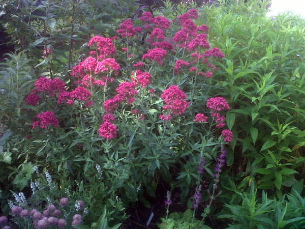 There are some successes to report. Plants that impressed me with their power to laugh in the face of drought and heat. Ornamental Oregano“Kent Beauty” (see last post) was just as fresh and lovely as ever. My two Blue Mist/Caryopteris shrubs, perhaps because they originate from the South, ignored the early arriving summer and just progressed through the season as usual, blooming in late summer and looking fabulous. Sedum, whether it’s tall or a groundcover, is a godsend. I vow to plant more next year. Sometimes, they were the only plants that didn’t look parched. For annuals, my Alyssum (from seed planted a few years ago) continued to bloom all summer. And while the petunias got gangly, I am impressed they continued to live in my planter on the patio all season. But my favorite most beloved plant this year was my Red Valerian plant (Centranthus ruber “Pretty Betsy). It’s lovely cool green leaves have resisted disease, drought, insects, everything, and it keeps producing rounds of red flowers all summer, from way back in May till now. When I find another one of these in the store next year (it’s still hard to find and it is not the sort of plant you can divide), I am snatching it up. You must build your team (or your garden) out of winners if you want to make it through a tough season.